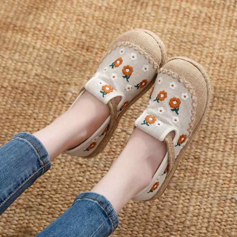 シューズ レディース 通気性 軽量 吸汗性 民族風 レトロ 刺繍 花柄 草編み リネン 布製 手編み・・・