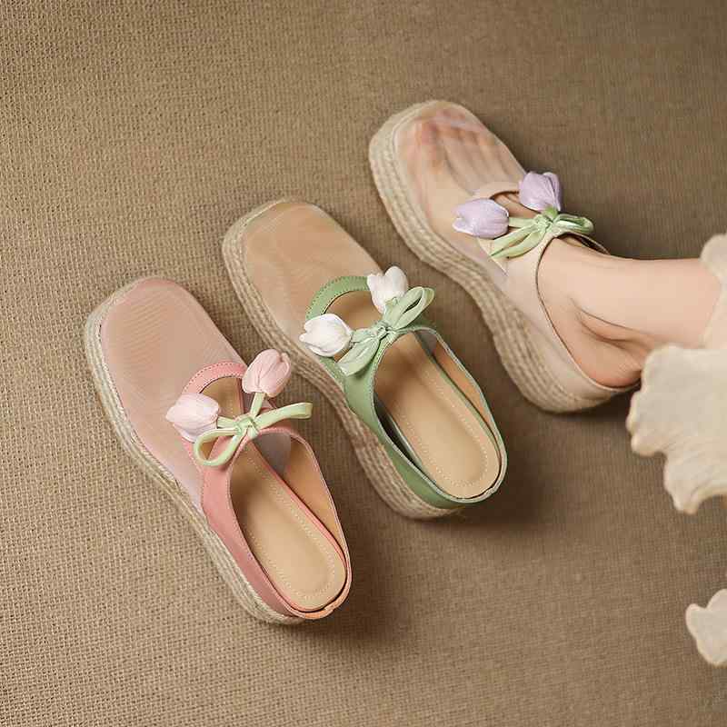 サンダル レディース 厚底 ミュール 9.5cmヒール ラウンドトゥ つま先保護 本革 ストロー メ・・・