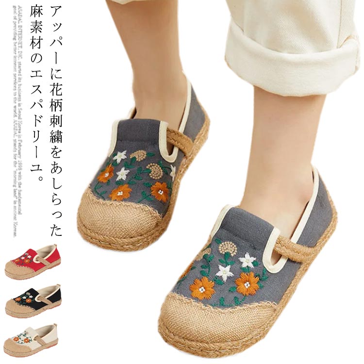 スリッポン エスパドリーユ 花柄 刺繍 レディース 麻 リネン ジュート シューズ 靴 春夏 涼しげ・・・