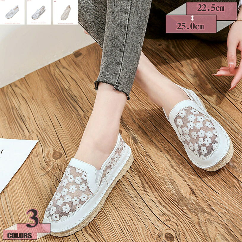 シューズ レディース エスパドリーユ フラットシューズ スリッポン ぺたんこ 靴 春夏秋 レース 花・・・