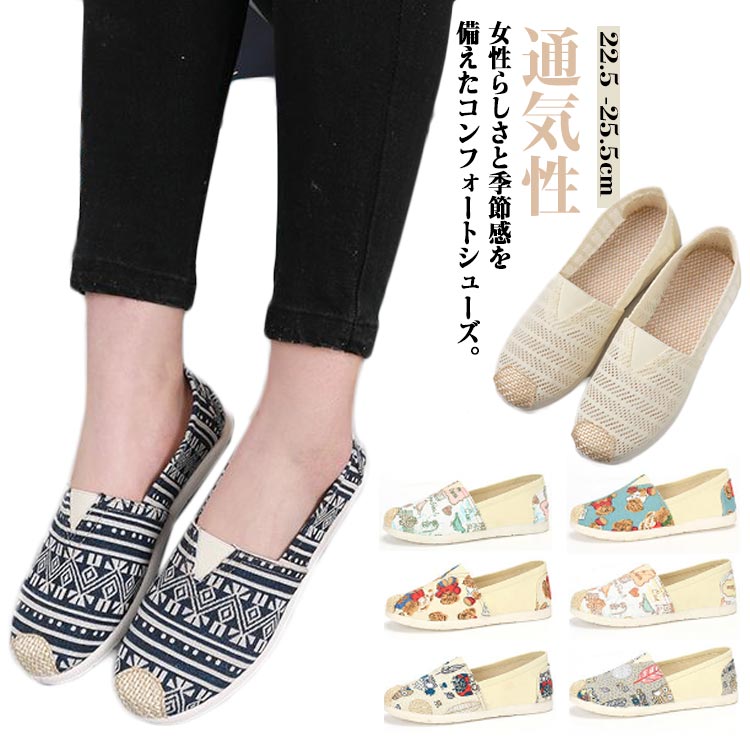 スリッポン レディース 布製 メッシュ エスパドリーユ フラットシューズ 柔らかい クッション性 通・・・