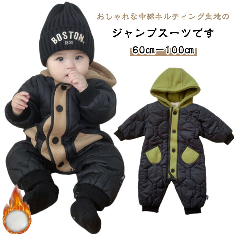 ジャンプスーツ 雪遊び ベビー カバーオール キルティング 中綿 裏起毛 オールインワン つなぎ キ・・・