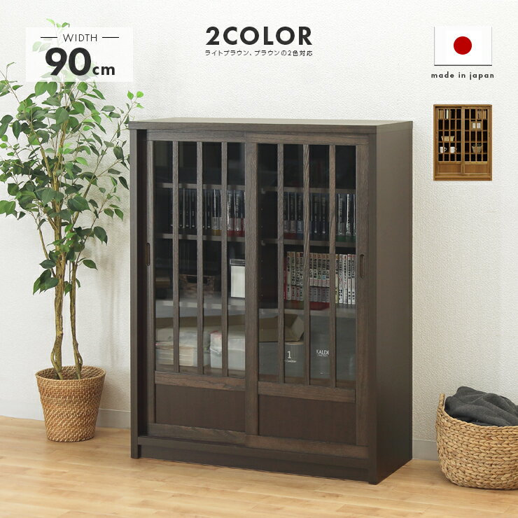 キャビネット 完成品 引き戸タイプ 幅90cm ガラス扉付き