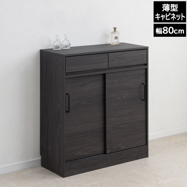 薄型キャビネット 幅80cm 引き戸式扉 Blacker ブラック木目 収納家具 FY-0176LV・・・