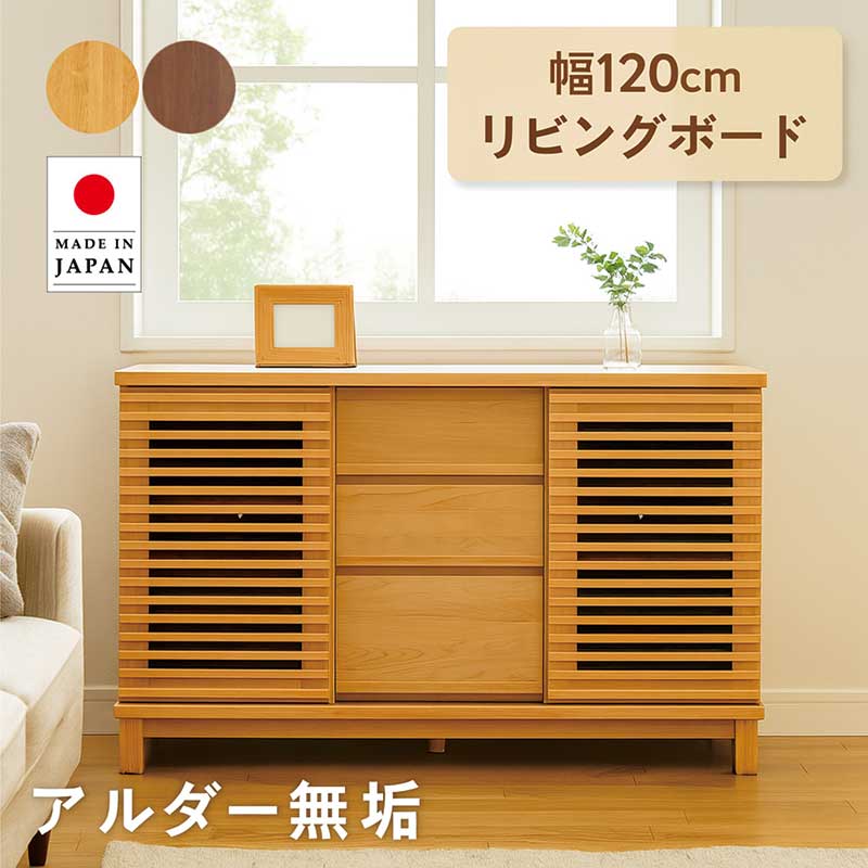 リビング収納 引き戸 引き出し 棚 幅120cm 大川家具 無垢 ルーバー 格子 サイドボード リビ・・・