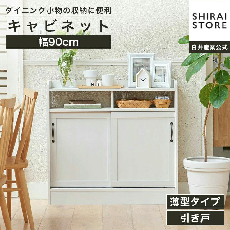 キャビネット 棚 幅90cm 高さ86cm ホワイト 白木目 カウンター下 薄型 引き戸 収納 カウ・・・