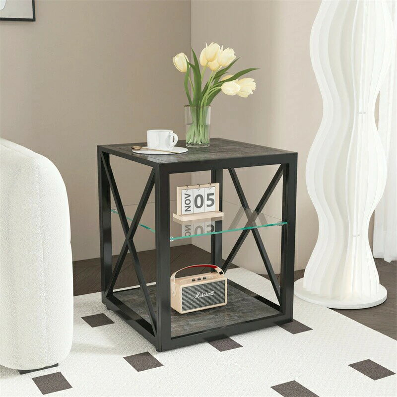 1点 モダンサイドテーブル 寝室・リビング用 強化ガラス天板×ウッド調MDF インダストリアルスタイ・・・