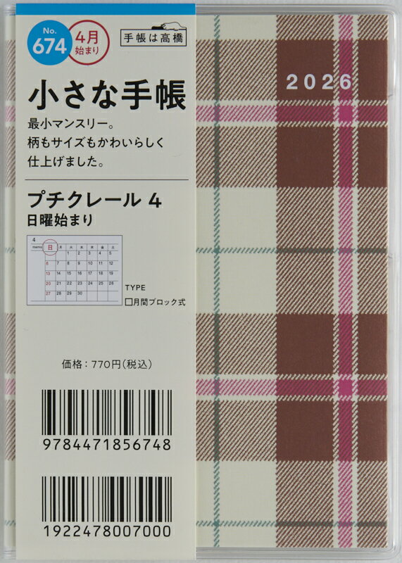 TAKAHASHI 高橋書店 2026 4月始まり 手帳 B7 No.674 プチクレール 4 高橋・・・