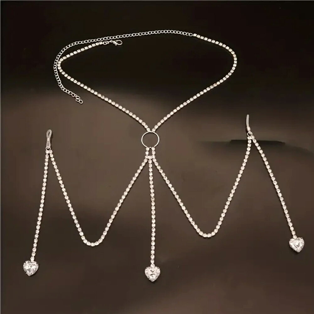 [ ノンホール ニップルクリップ付き ] トリプルハートチャームクリスタルビキニニップルボディチェー・・・