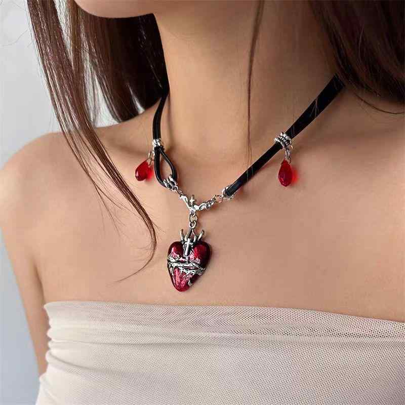 ネックレス レディース ゴシック パンク クール系 個性的 赤色 エナメル加工 棘 ハート レザーコ・・・