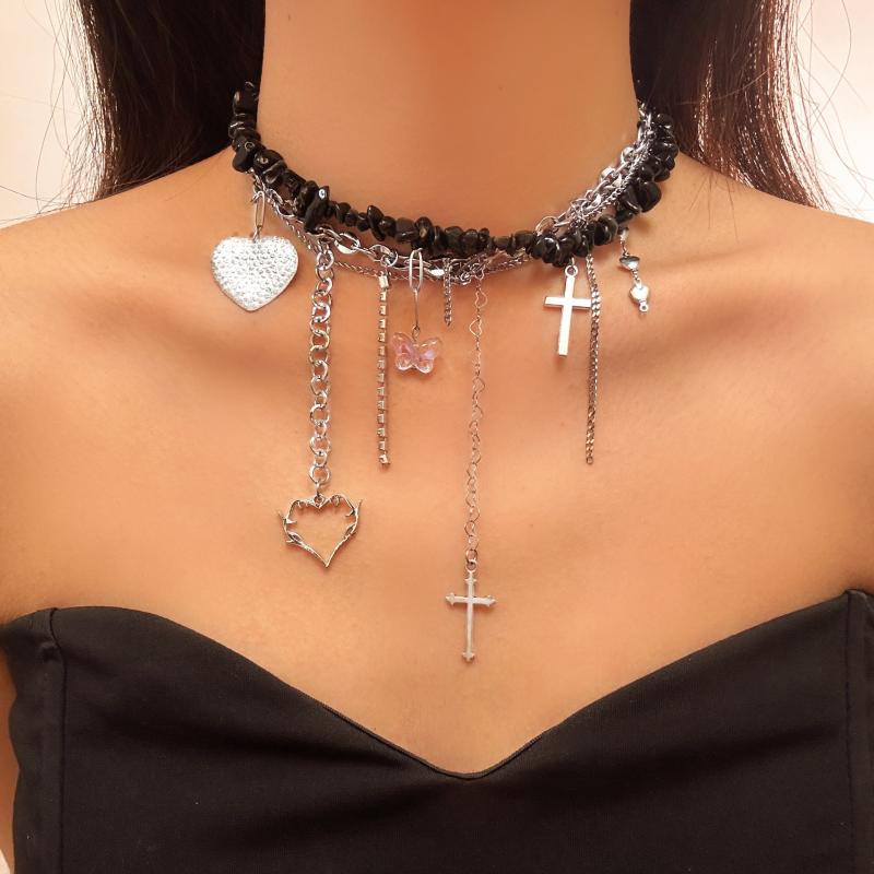 ネックレス レディース 合金製 電気メッキ メタルチェーン ハート クロス 蝶モチーフ タッセルペン・・・