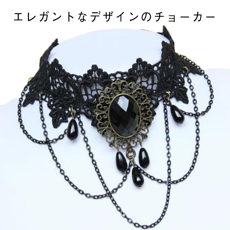 チョーカー ネックレス レディース 黒 レース チェーン ストーン コスプレ イベント パーティ h・・・