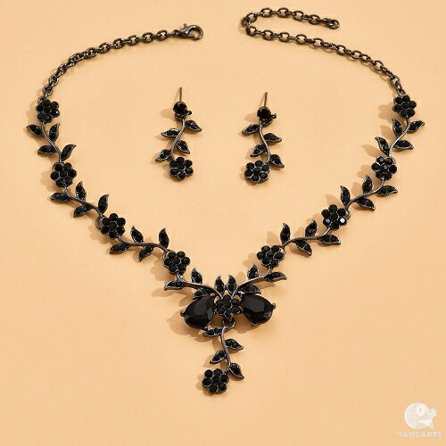 ビジュー ラインストーンネックレス&ピアスセット フラワーモチーフ(ブラック)【結婚式 パーティー ・・・