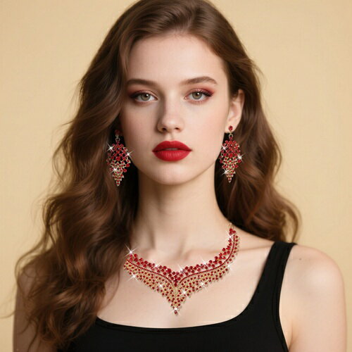 ラグジュアリーカラービジュー V字ネックレス+ピアスセット(レッド)抜群の存在感【結婚式 パーティー・・・