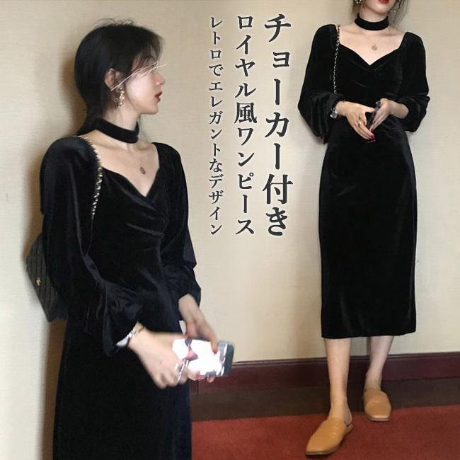 春 夏 ワンピース ドレス レディース 長袖ワンピース チョーカー 2点セット ベロアワンピース ス・・・
