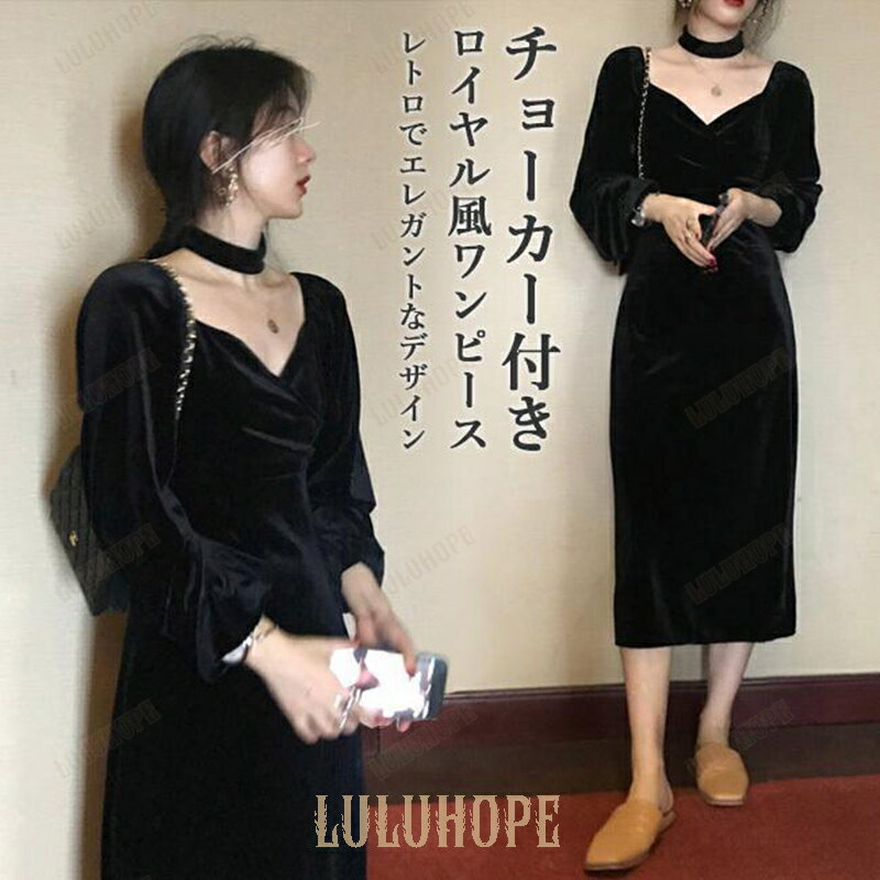 ワンピース レディース 長袖ワンピース チョーカー ベロアワンピース ロングワンピ 秋 春 パーティ・・・