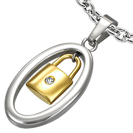 ゴールドロックチャームステンレスペンダントトップ 南京錠 ゴールド クリスタル ジルコニア サージカ・・・