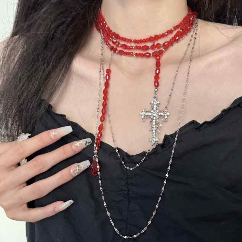 ネックレス レディース 重ね付け 多層 レイヤード 十字架 クロス レッドクリスタル フリンジ タッ・・・