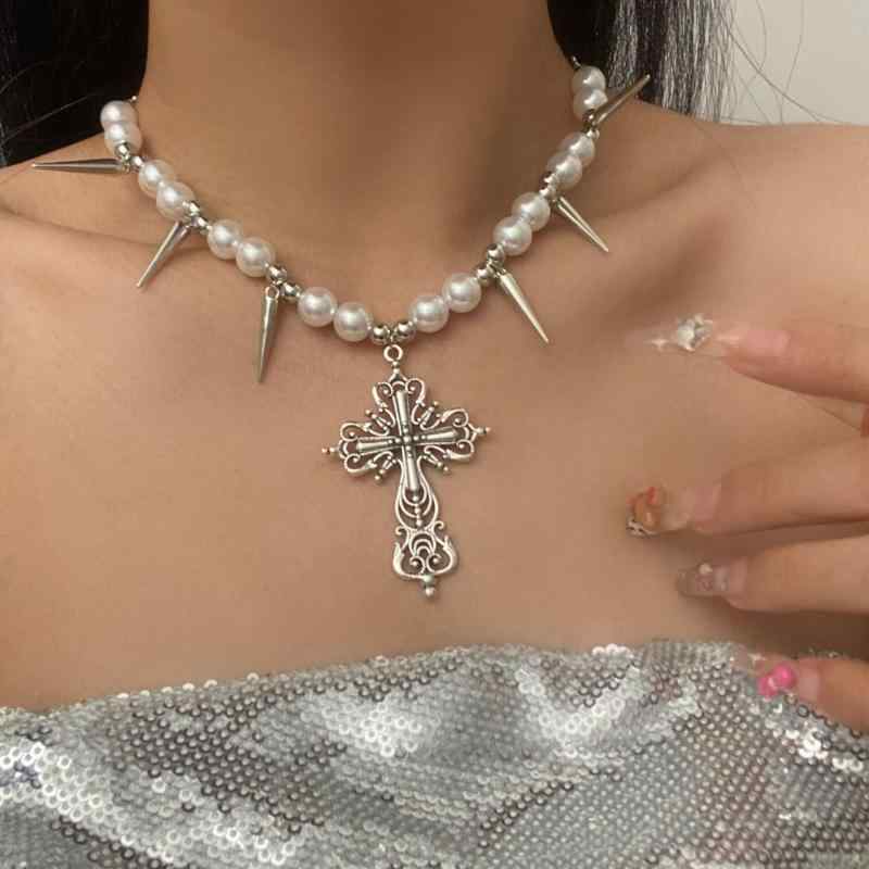 ネックレス レディース Y2K サブカルチャー パンク 個性的 スタッズ パール クロス チョーカー・・・