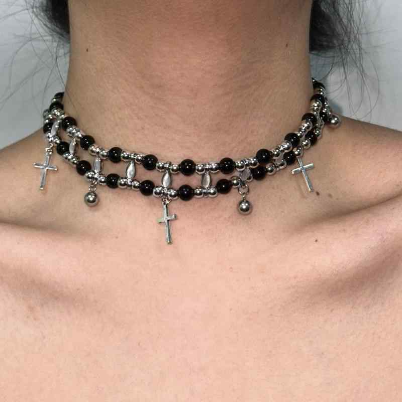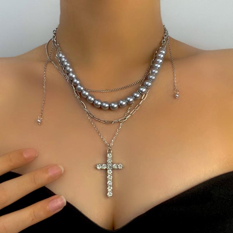 ネックレス レディース パンク ロック 重厚感 十字架 タッセル フェイクパール 多層 チョーカー ・・・