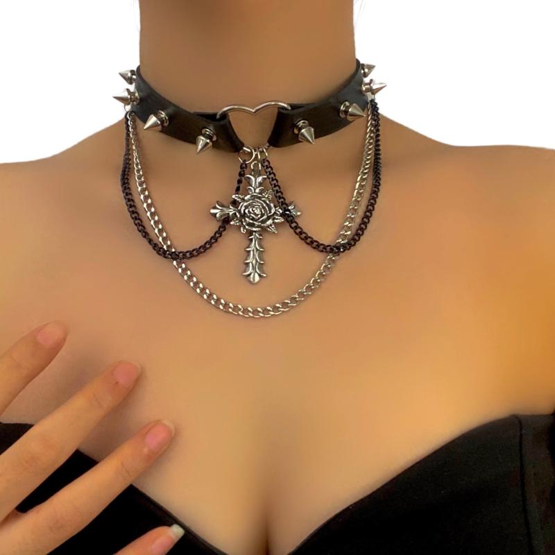 チョーカー レディース パンク ゴシック ロックファッション 十字架 スタッズ レザー フリンジ 欧・・・