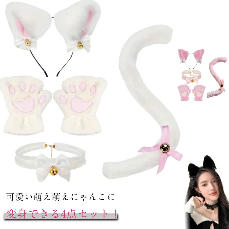 猫耳 カチューシャ 肉球手袋 猫しっぽ チョーカー 4点セット 鈴付き ハロウィン 仮装 小物 コス・・・