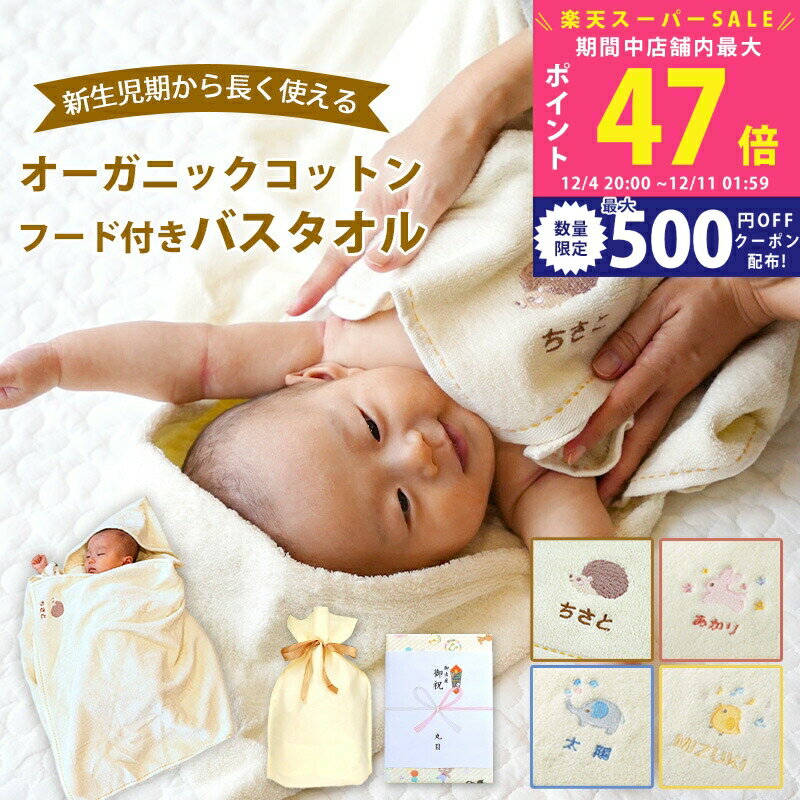 【スーパーSALE特別クーポン】出産祝い 名入れ 男の子 女の子 オーガニックコットン フード付きバ・・・