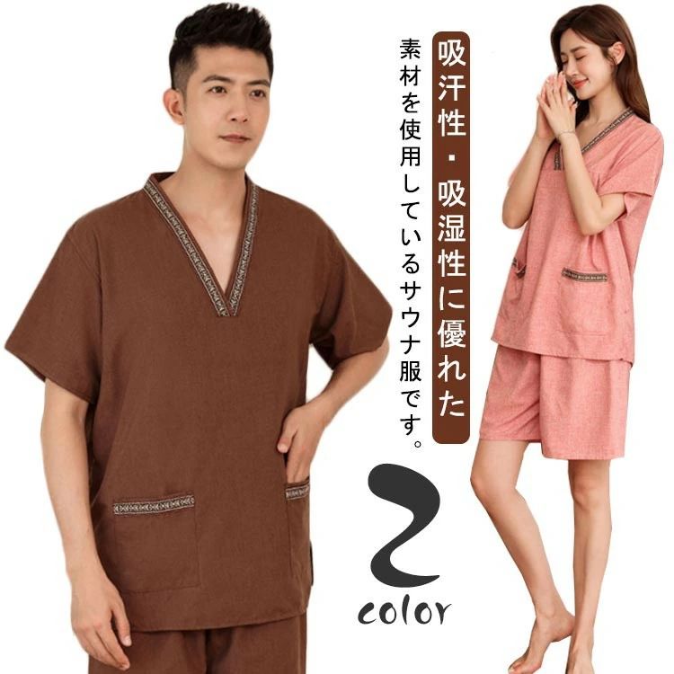 ルームウェア サウナ服 バスローブ メンズ カップル 綿混 セットアップ 半袖 トップス レディース・・・