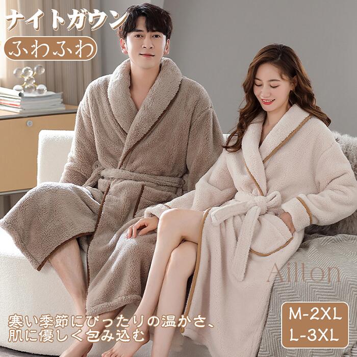 バスローブ ペア カップル もこもこ 冬 パジャマ 無地 ロング ルームウェア タオル地 レディース・・・