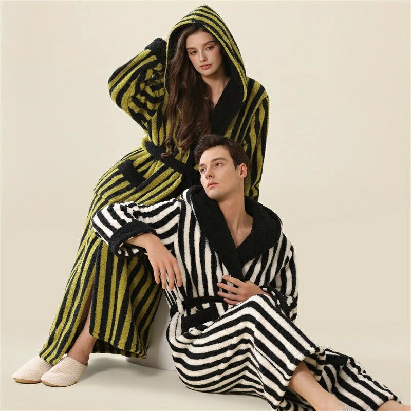 メ バスローブ単品 レディース タオル地 ルームウェア フーデッド 秋冬 ストライプ 冬 防寒 もこ・・・