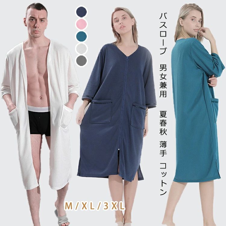 夏 ファスナー 速乾 膝丈 ワッフル生地 前開き 七分袖 レディース メンズ ガウン 薄手 ホテル ・・・