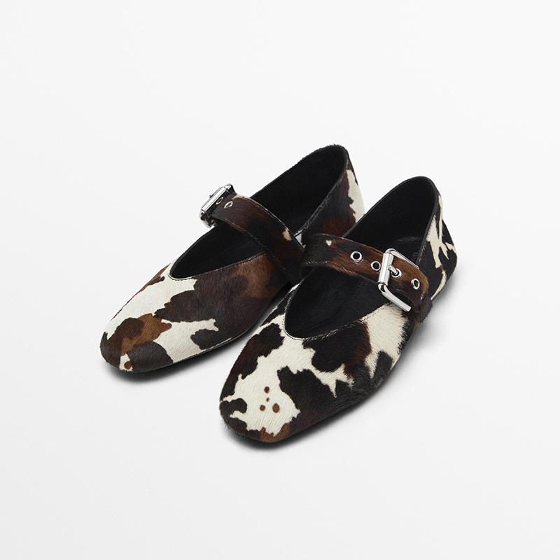 シューズ レディース 本革 羊革 フラットソール ラウンドトゥ ヒョウ柄 ハラコ調 メリージェーン ・・・