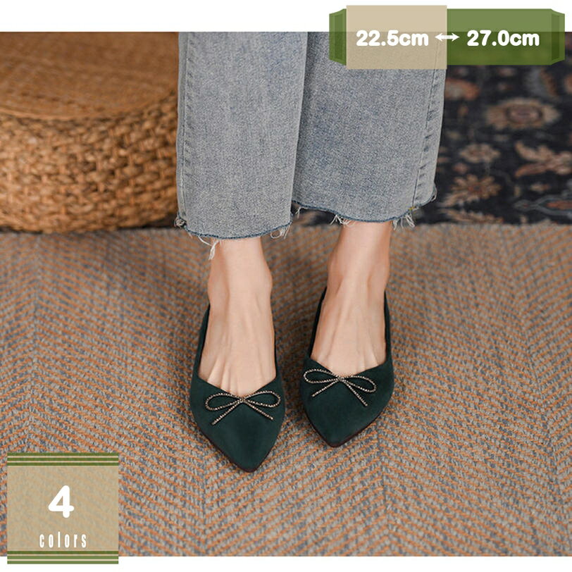 アーモンドトゥシューズ パンプス Vカット レディース 靴 バレエシューズ スエード きれいめ りぼ・・・