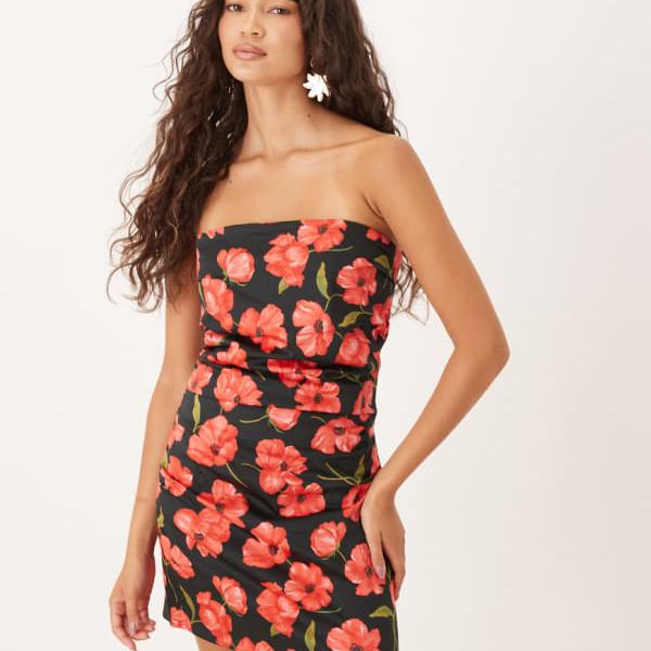 マンゴ MANGO Mango マンゴーのバンドゥ ルーシュ サイド ミニドレス(レッド フローラル・・・