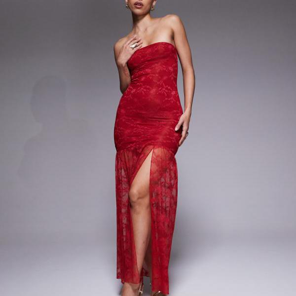 Kaiia限定、ダブルレイヤーのスリンキーレースバンドゥ、シアーヘムのマキシドレス(レッド) ワンピ・・・