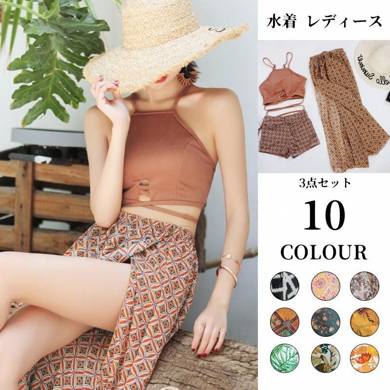【送料無料】水着 レディース 体型カバー ビキニ バンドゥ ハイネック 3点セット エスニック柄 無・・・