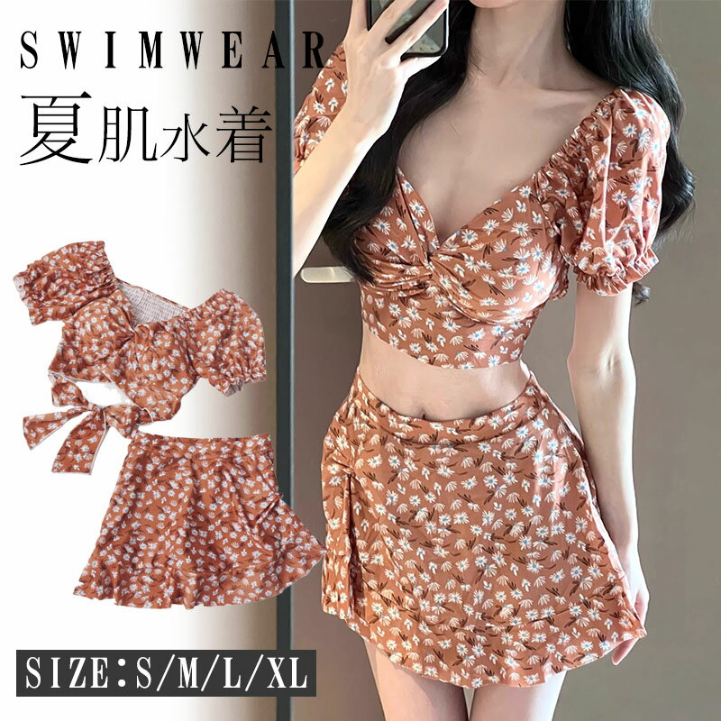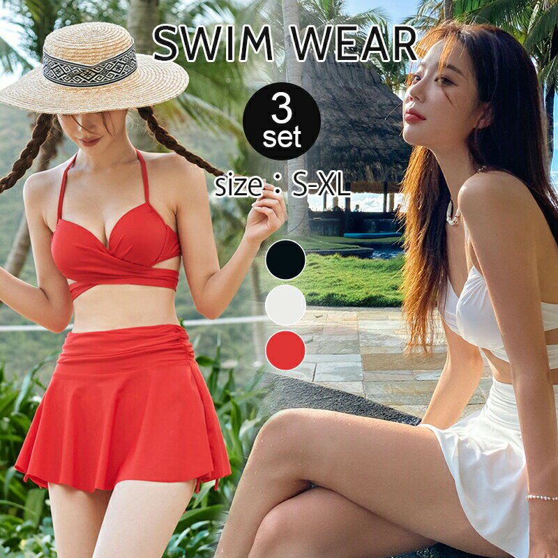 水着 レディース ビキニ バンドゥ フリル リボン ビーチウェア 3点セット スカート パッド付き ・・・