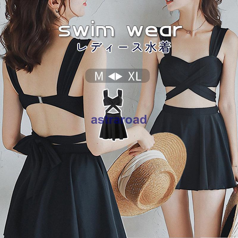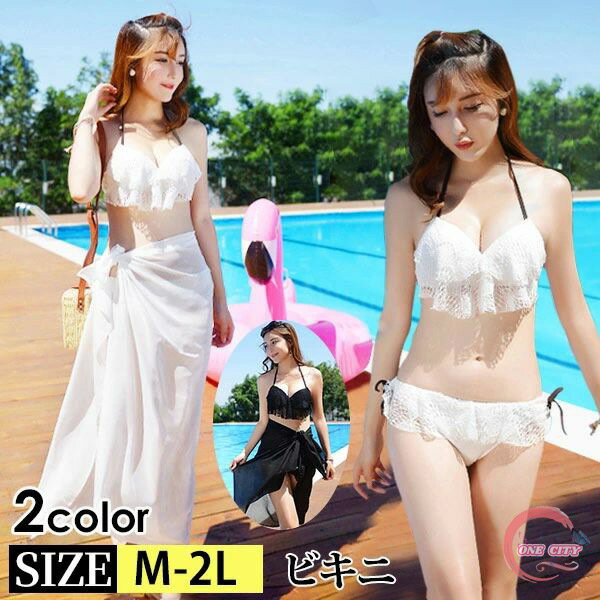 水着 レディース ビキニ バンドゥ フリル リボン ビーチウェア 3点セット スカート パッド付き ・・・