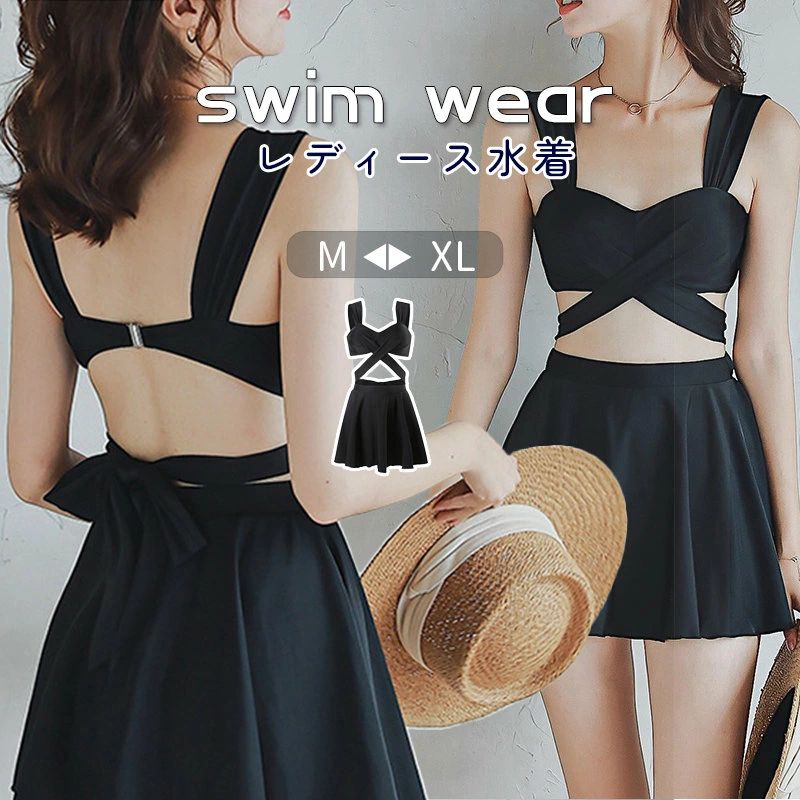水着 レディース ビキニ バンドゥ フリル ブラック リボン ビーチウェア 3点セット スカート パ・・・