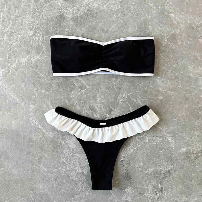 ビキニ レディース バンドゥ フリル トライアングル ビーチ 温泉 水着 セクシー 無地 パッド入り・・・