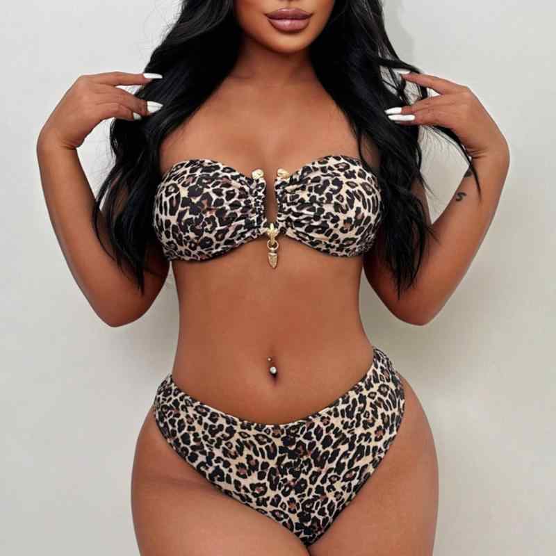 水着 レディース セクシー ヒョウ柄 バンドゥ ビキニ 胸パッド付き ノンワイヤー ツーピース 欧米・・・