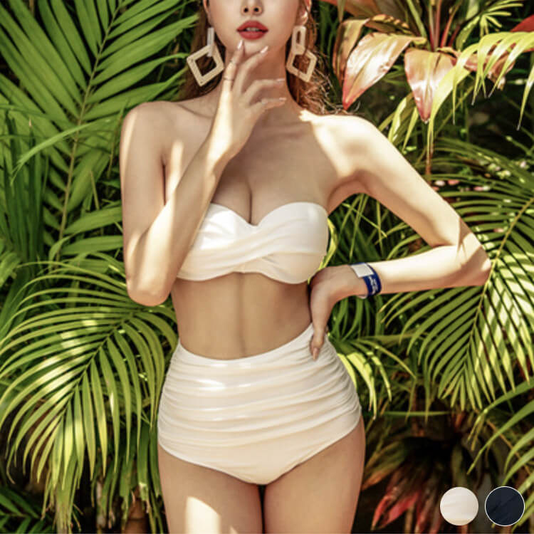 バンドゥビキニレディースビキニバンドゥベアトップハイウエスト白ホワイトギャザーセクシー水着シンプルク・・・