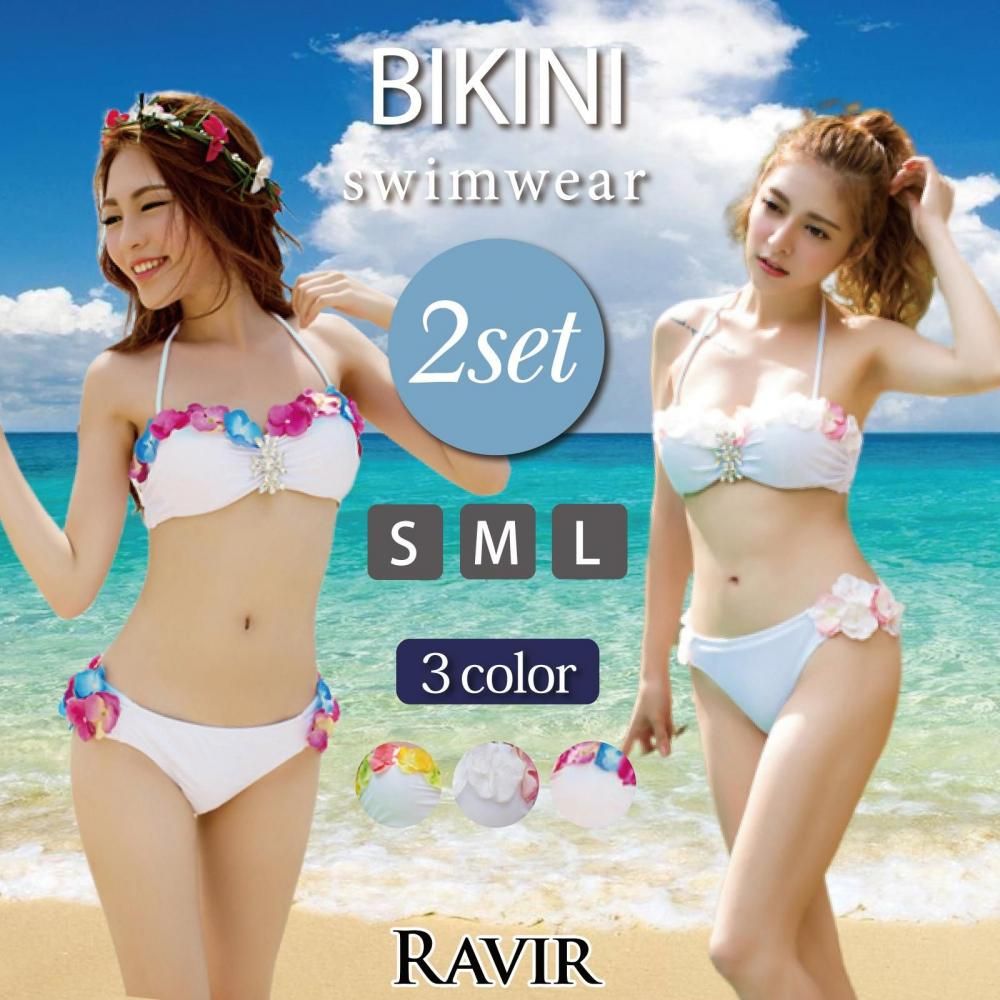 レディース 水着 花びら ビキニ バンドゥ ビジュー 付き フラワー デザイン水着 2点セット M/・・・
