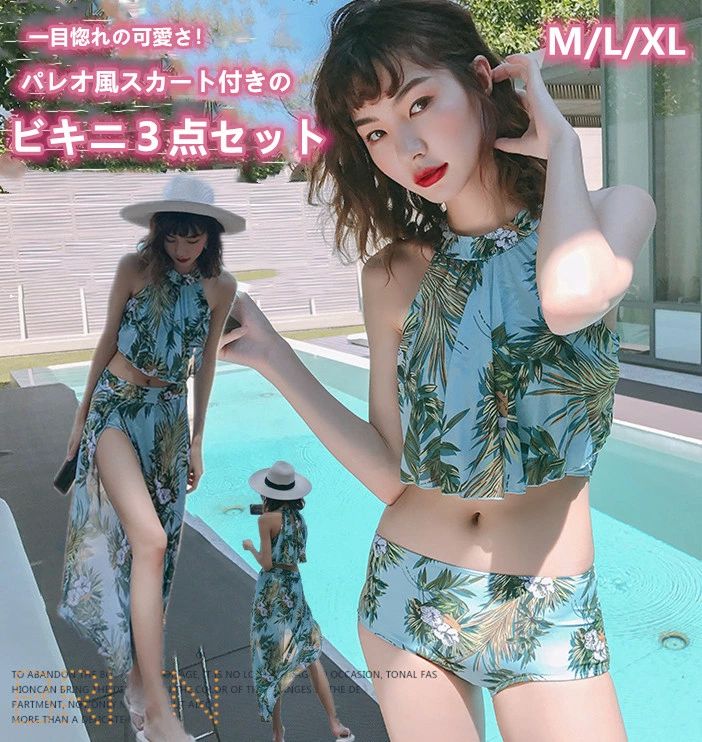 フェザー柄 花柄 リーフ柄 パレオ風 スカート ブラ バンドゥ ハイネック パット付き ワイヤー入り・・・