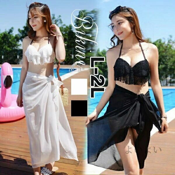 【送料無料】水着 バンドゥ レディース セクシー ビキニ ワイヤー入り レース パレオ付き 3点セッ・・・