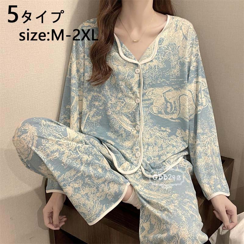 パジャマ レディース 長袖 長ズボン 春秋 セットアップ ルームウェア 上下セット 前開き プリント・・・