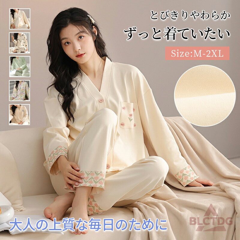 レディースパジャマ コットン100% パジャマセット レディース ルームウェア 長袖 長ズボン 上下・・・