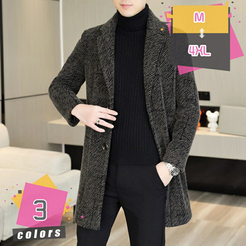 1000円OFFクーポン メンズ ロングコート スリム チェスターコート 無地 カジュアル メンズコ・・・