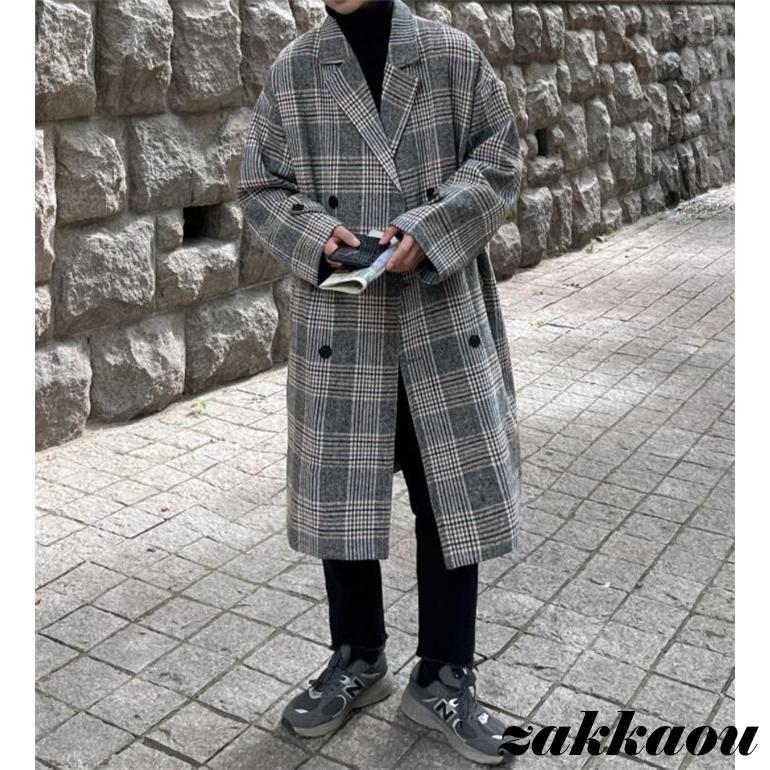 ステンカラーコート メンズ オーバーチェックジャケット ミドル ピーコート 50代 ロング スタンド・・・