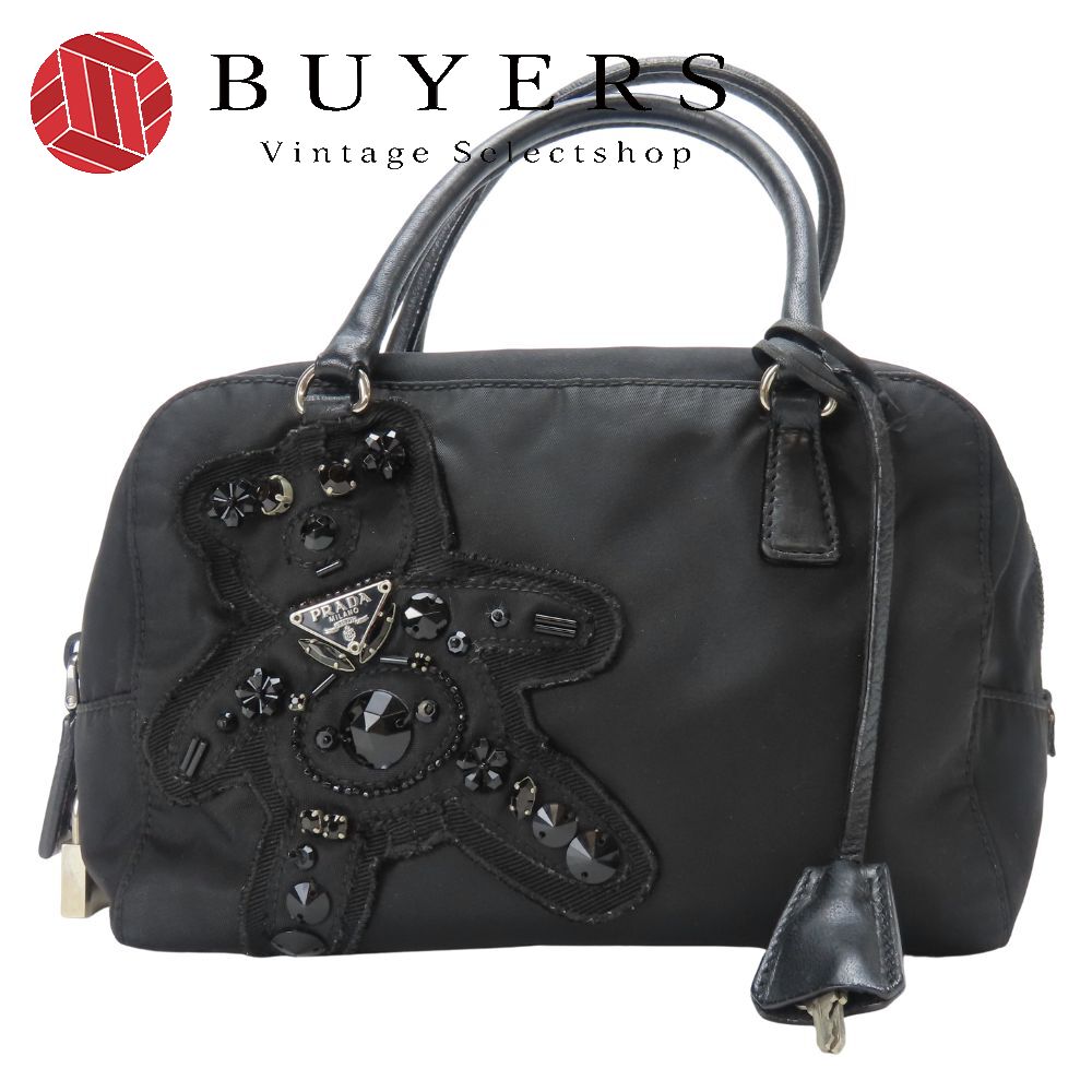 【中古】 プラダ ハンドバッグ BN1134 イブニングベア ナイロン レザー ビジュー NERO ・・・
